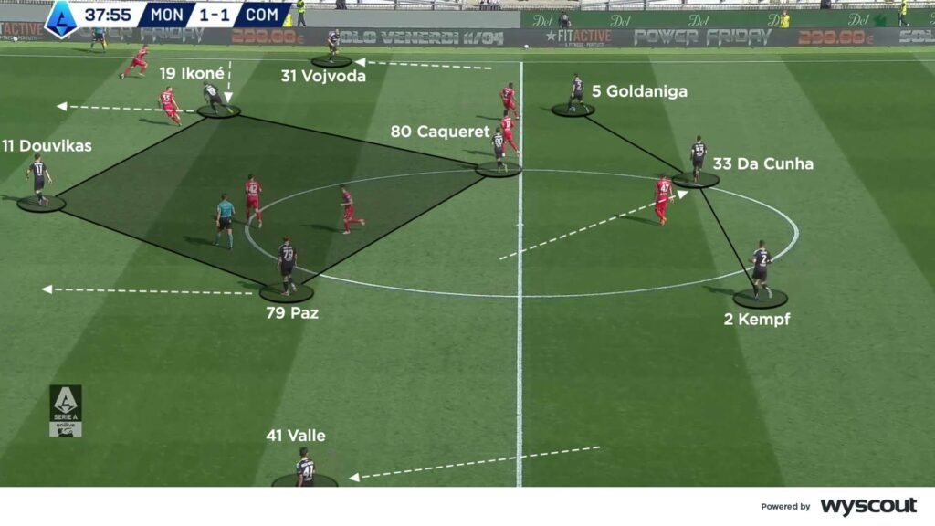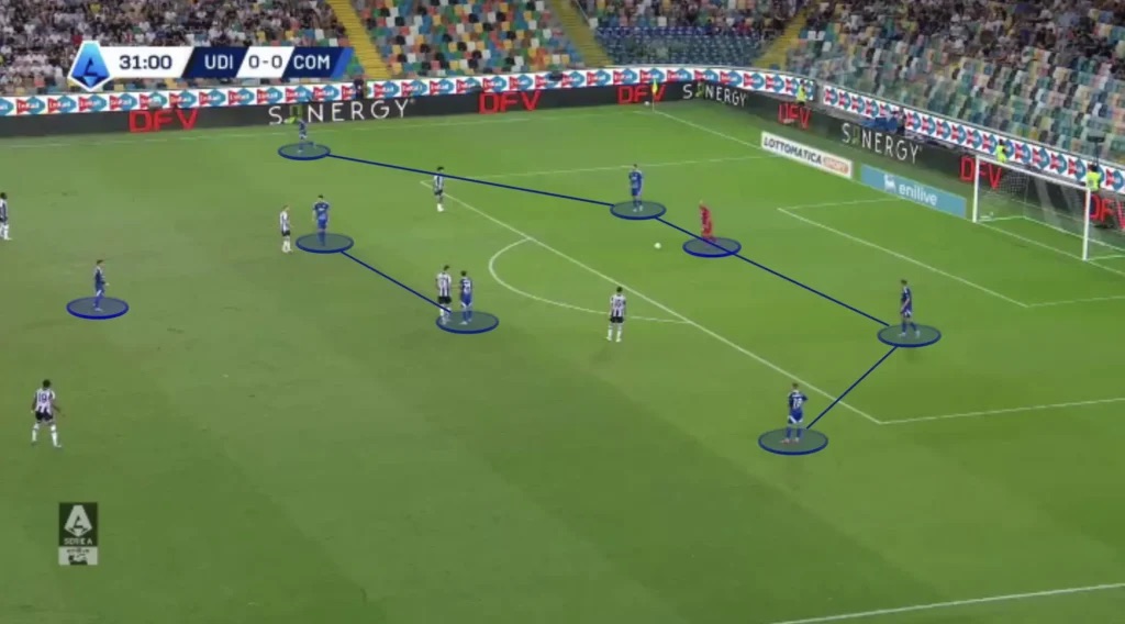 Chaque joueur est savamment étudié pour correspondre à la tactique de Cesc Fabregas. La justesse technique est l’une des qualités les plus importantes à Côme, où le gardien et la ligne arrière jouent d’ailleurs un rôle crucial dans la construction des offensives. Jean Butez est le premier relanceur, et participe au jeu de possession. Jacobo Ramon s’est rapidement fondu à cette équipe, ses capacités de relance étant particulièrement mises en avant. En faisant reculer les milieux dans l’arrière garde en phase de construction, Fabregas s’assure des circuits de passes fluides, et un jeu toujours tourné vers l’avant.